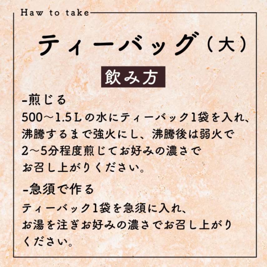 急須にティーバッグ1袋を入れ、500mlのお湯を注ぎます。2〜3分程おき、お好みの濃さでカップに注いでお召し上がりください。